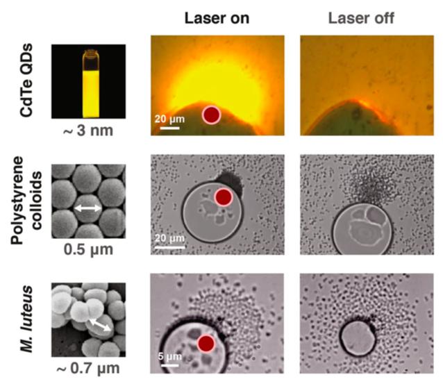 为了进一步考察这种规律的影响因素,研究小组甚至尝试了各种大小以及各种类型的颗粒进行实验。小到只有约3纳米量子尺度的碲化镉(CdTe)团块,大到超过15微米的人体细胞,跨越了4个数量级(图3)。