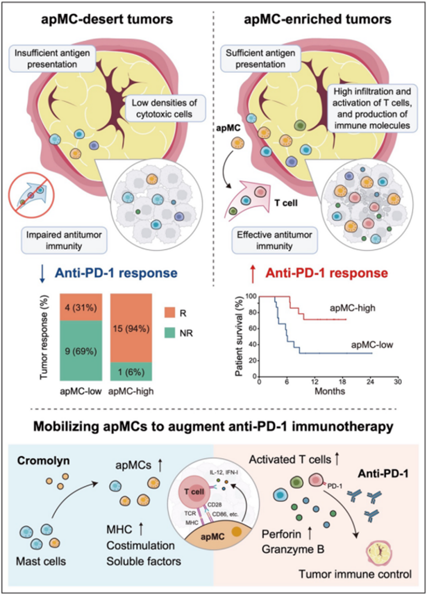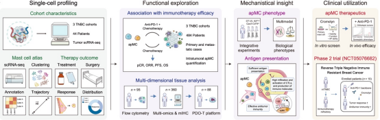 2025年6月25日,复旦大学附属肿瘤医院乳腺外科邵志敏教授、江一舟教授团队在国际著名学术期刊《自然·医学》(Nature Medicine)发表的一项研究成果显示,该团队基于AI技术,整合528例三阴性乳腺癌患者多模态信息,首次明确非典型的抗原呈递肥大细胞(apMC)是抗PD-1免疫治疗效果发挥的关键因素,它可以激活肿瘤反应性T细胞,促进抗肿瘤免疫应答。