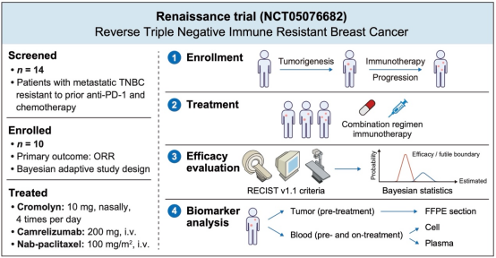 研究团队还发现,临床常用的抗过敏药物——色甘酸钠可以诱导抗原呈递肥大细胞,从而逆转肿瘤患者免疫治疗耐药的情况。基于此,该团队构建全球首个乳腺癌领域逆转免疫治疗耐药的临床研究平台——“复兴”(Renaissance),并针对既往免疫治疗耐药、后续几乎“无药可医”的转移性三阴性乳腺癌患者,开展“色甘酸钠+免疫治疗”创新靶向免疫治疗策略临床研究。结果显示,采用该种创新靶免方案的患者治疗有效率,从既往的约10%大幅提升到50%。
