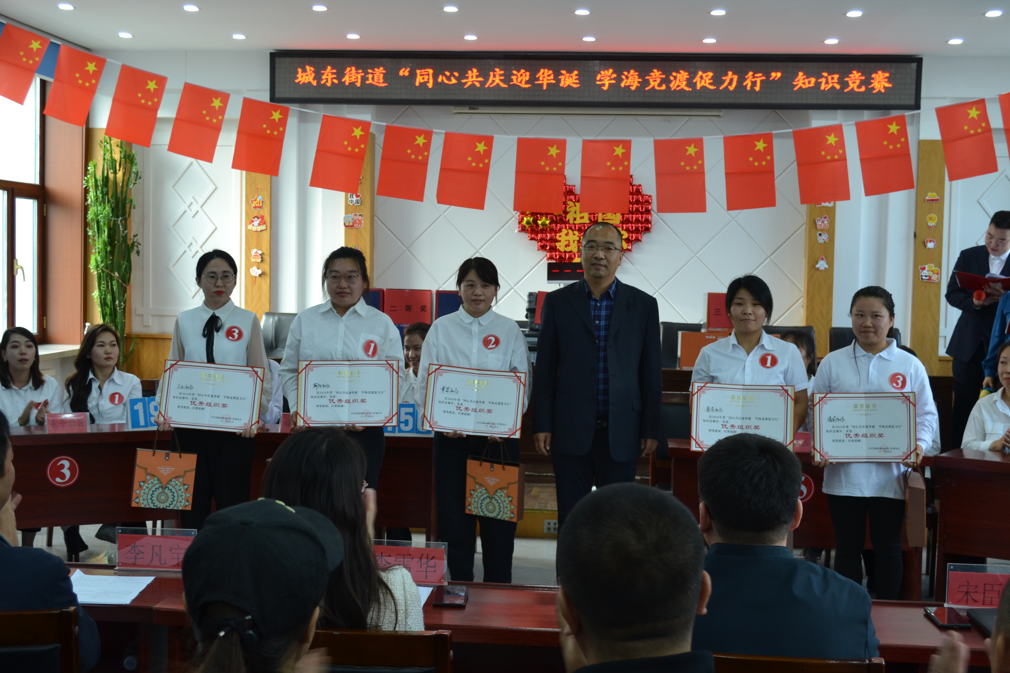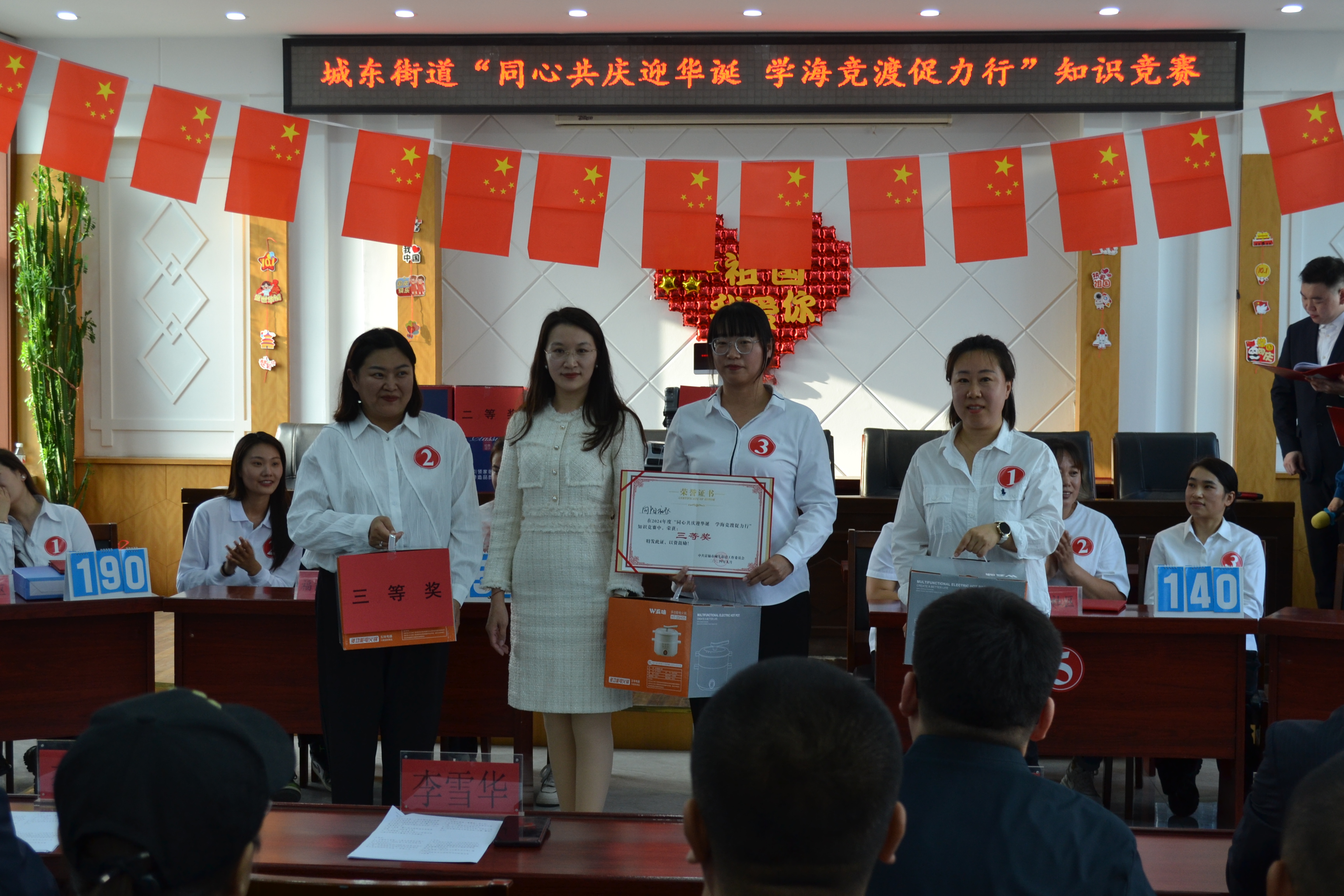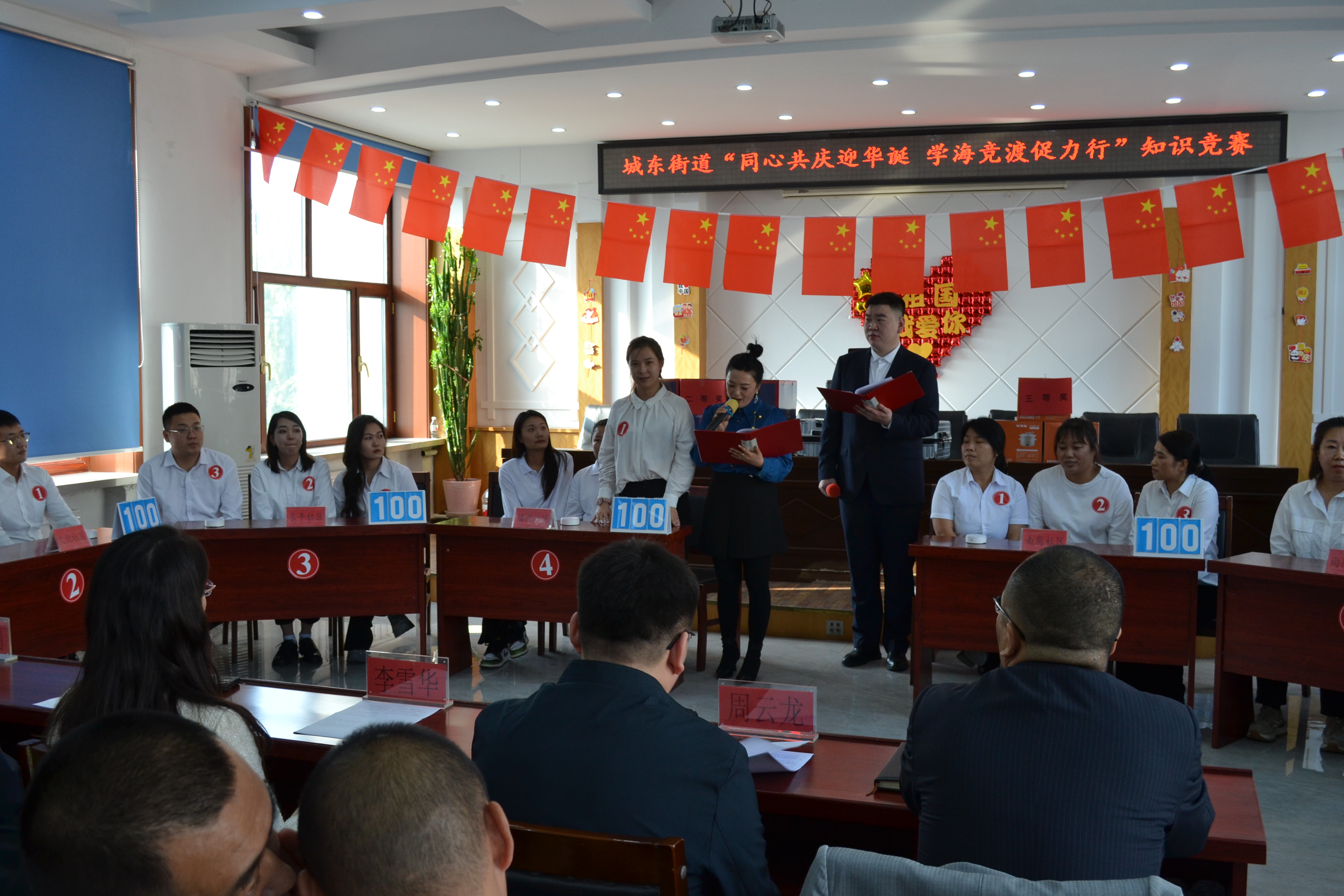 为庆祝新中国成立75周年,深入学习党的二十大和二十届三中全会精神,激发广大党员干部和社区网格员的工作热情与创造力,进一步提升工作人员的工作能力与专业素养,9月29日下午,由富锦市城东街道办事处主办,富锦市委组织部、富锦市委宣传部支持的以“同心共庆迎华诞 学海竞渡促力行”为主题的知识竞赛在城东街道三楼大会议室举行。富锦市城东街道党工委书记李雪华,富锦市委组织部副部长李凡宝,以及富锦市委宣传部副部长周云龙出席了本次知识竞赛。