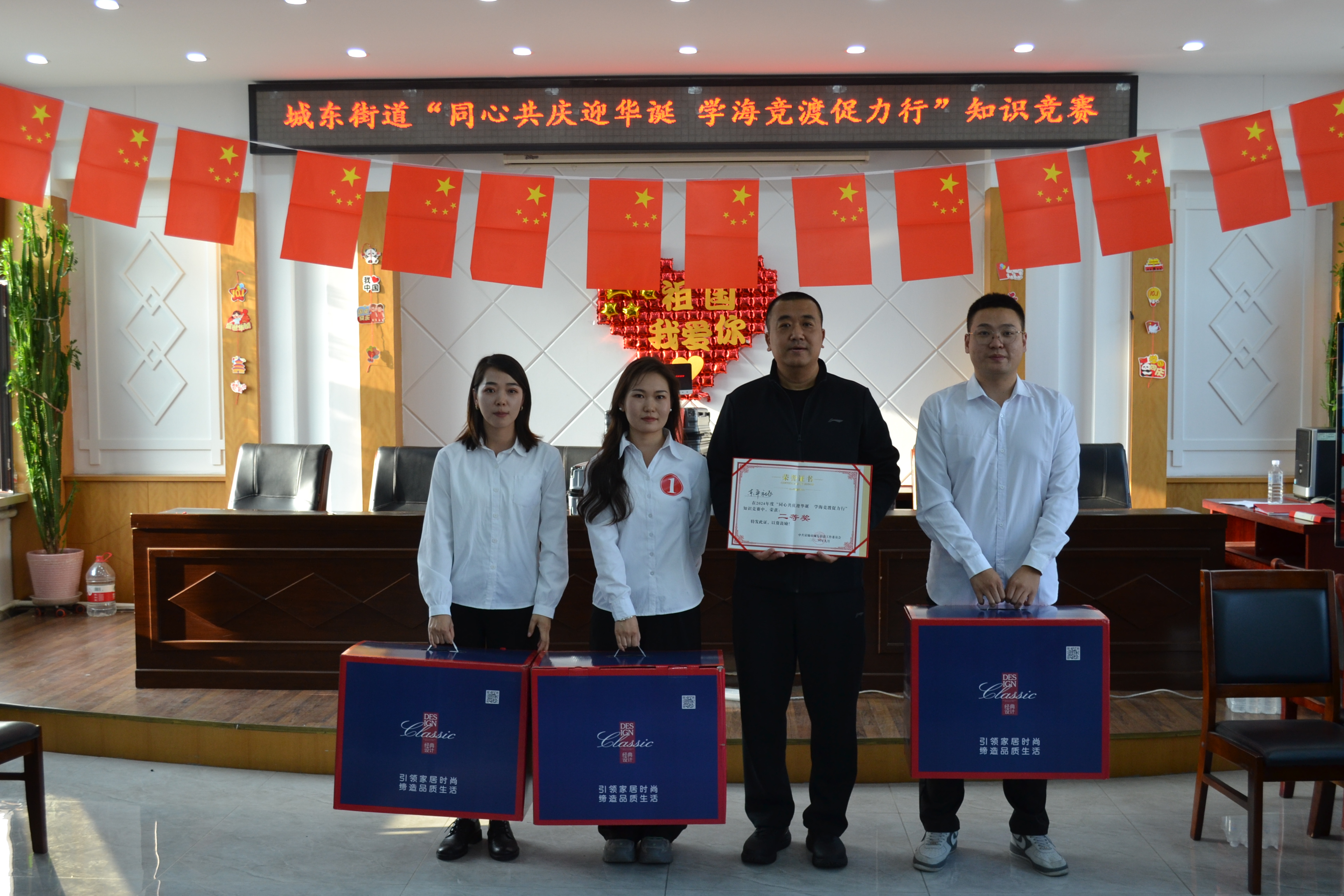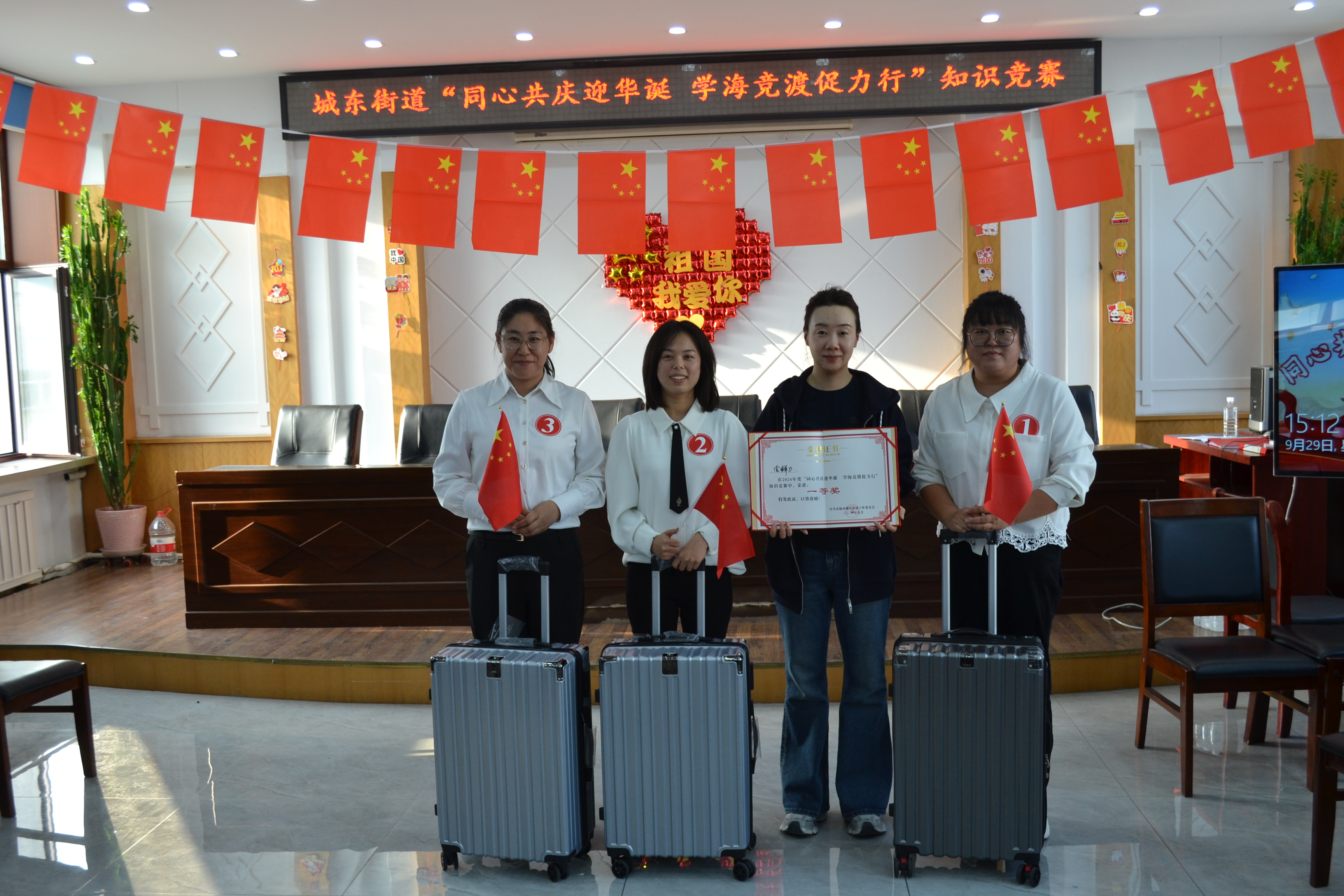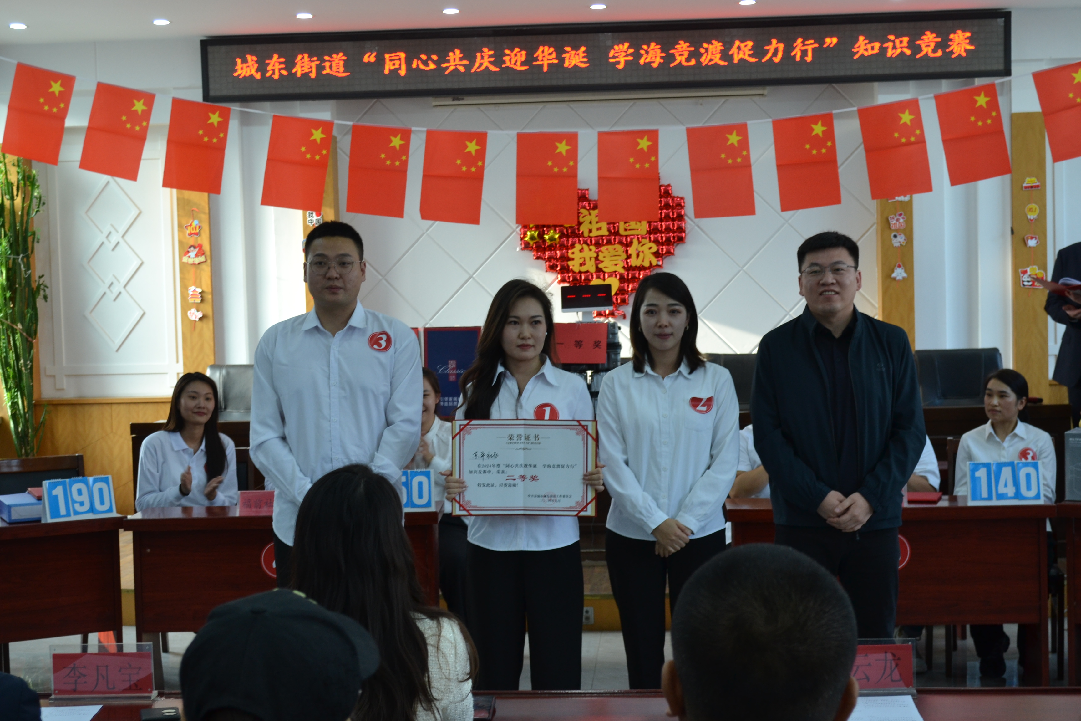 为庆祝新中国成立75周年,深入学习党的二十大和二十届三中全会精神,激发广大党员干部和社区网格员的工作热情与创造力,进一步提升工作人员的工作能力与专业素养,9月29日下午,由富锦市城东街道办事处主办,富锦市委组织部、富锦市委宣传部支持的以“同心共庆迎华诞 学海竞渡促力行”为主题的知识竞赛在城东街道三楼大会议室举行。富锦市城东街道党工委书记李雪华,富锦市委组织部副部长李凡宝,以及富锦市委宣传部副部长周云龙出席了本次知识竞赛。