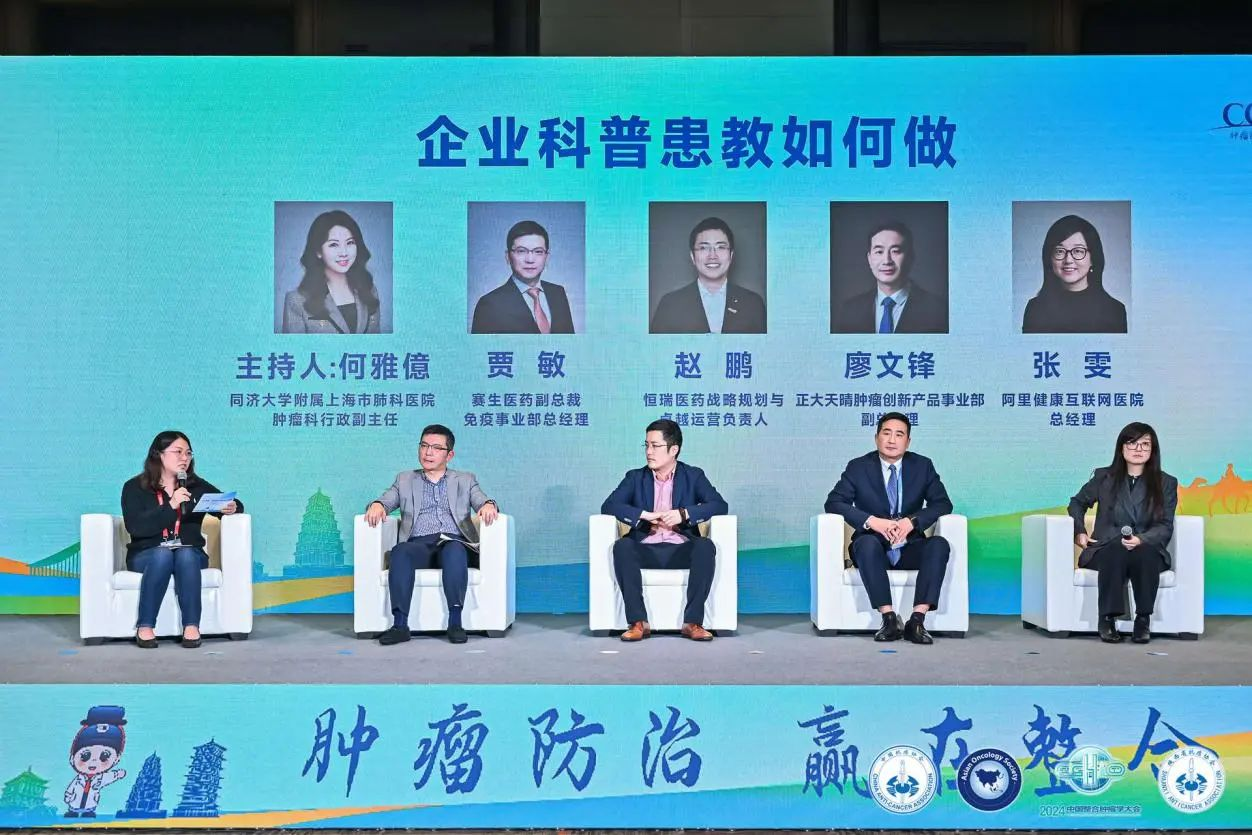 肿瘤科普在肿瘤防治中起着不可或缺的重要作用,与之对应的第二组圆桌论坛,讨论议题为“企业科普患教如何做”,由同济大学附属上海市肺科医院的何雅億教授主持。参与讨论的嘉宾有赛生医药副总裁、免疫事业部总经理贾敏,恒瑞医药战略规划与卓越运营负责人赵鹏,正大天晴肿瘤创新产品事业部副总经理廖文锋和阿里健康互联网医院总经理张雯。