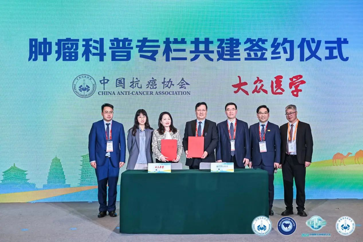 支修益教授和《精品》健康家庭杂志顾问、内容负责人张广有总监作为代表进行中国抗癌协会和《精品》健康家庭杂志肿瘤科普专栏共建签约仪式,田艳涛教授、陈小兵教授、尧小兵副秘书长、宋亚波副秘书长和享佳健康总经理助理崔韶婉共同见证。