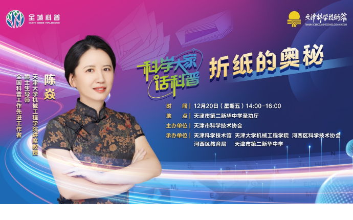 为贯彻党的二十届三中全会精神,落实习近平总书记关于科学普及工作重要指示精神,天津科技馆拟联合河西区科协开展“科学大家话科普”活动,邀请天津大学机械工程学院教授、全国科普工作先进工作者陈焱,到现场与师生分享交流,介绍基于折纸结构的工程装备,强调折纸艺术在跨学科领域的广泛应用和深远影响,促进科学知识的跨界传播,激发公众爱科学、学科学的兴趣,最大限度地启发观众, 开拓思维、增强创造力。