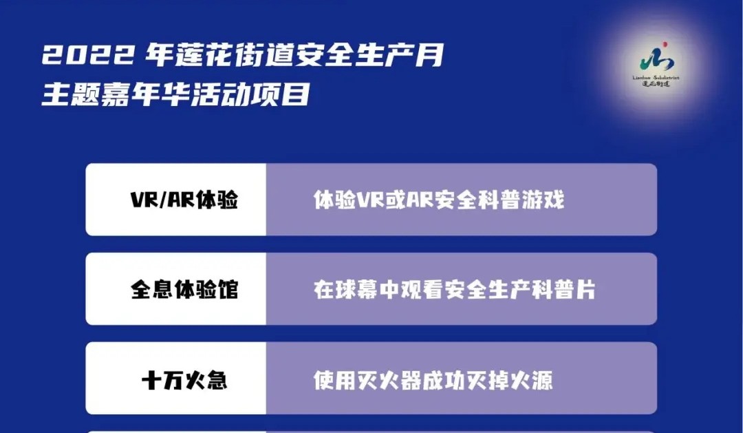 今年6月是第21个全国“安全生产月”。为加强居民群众的安全生产意识,更好普及生产安全、交通安全、消防安全、房屋安全等方面的知识,营造人人关注安全、人人重视安全、人人参与安全管理的良好氛围,福田区莲花街道举办了安全生产嘉年华活动。活动采用科技体验 游戏体验 沉浸体验的方式,通过打造深圳首家沉浸式安全宣传户外科技体验馆, 激发居民群众学习安全生产知识,掌握安全生产技能。