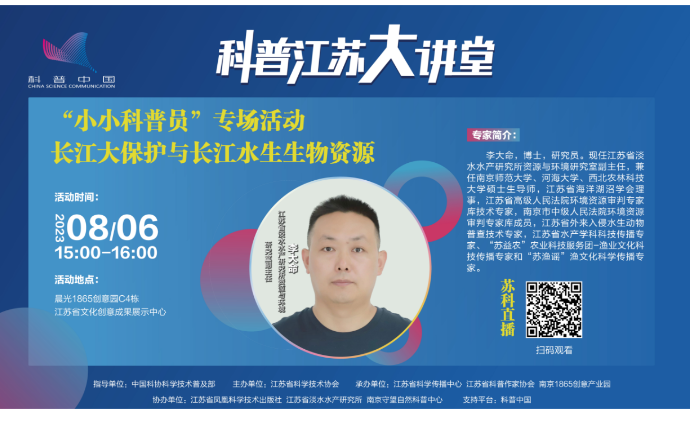 长江经济带是我国经济发展最快的区域之一,随着经济社会的发展,生态环境问题日益突出,如何保障长江经济带可持续发展是值得研究的问题。2017年7月,原环境保护部、国家发展和改革委员会、水利部联合发布《长江经济带生态环境保护规划》,提出了长江经济带生态环境保护的目标任务和重点工作;2020年12月全国人大常委会审议通过《中华人民共和国长江保护法》(以下简称《长江保护法》)。为了让公众更好地理解长江,了解长江大保护国家战略,邀请淡水水产研究所资源与环境研究室副主任,李大命博士讲授《长江大保护与长江水生生物资源》科普讲座。