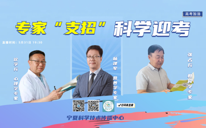 高考即将来临,考生们很容易产生焦虑、紧张等不良情绪。中高考牵动着每位考生家长的心,有些家长甚至比考生还紧张焦虑。应对高考,调节好心理状态、保持稳定的情绪至关重要。为此,宁夏科技传播中心特邀请心理专家、一线教育专家和营养专家做客直播间,聚焦考生如何调节好心理状态、家长如何陪伴孩子度过考试阶段、应考期间如何为考生们搭配合理饮食等问题进行指导,帮助您从“心”入手、轻松迎考!