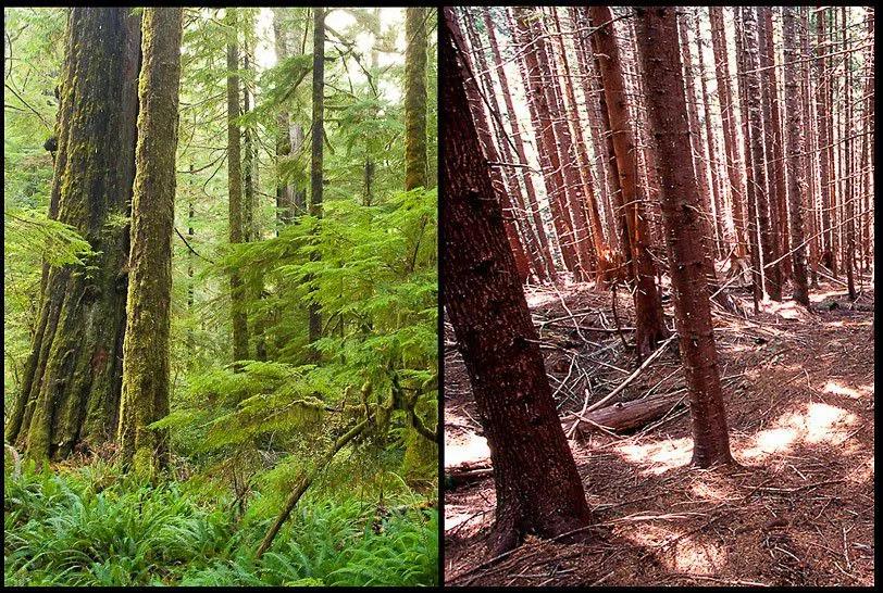 (左)古生林往往是大树和小树苗的混合,(右)经过砍伐或自然灾害形成的次生林,往往树木矮小,粗细差不多。| TJ Watt